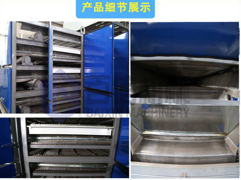 百信多層連續(xù)式烘干機(jī)脫水干燥迅速, 操作方便。能滿足大批量連續(xù)生產(chǎn)的需求,網(wǎng)帶式干燥設(shè)備廣泛應(yīng)用于食品(如面條、面皮)、干果(大棗、巴旦木、腰果、開心果)、花茶(玫瑰花、菊花、金銀花、百合花)、農(nóng)副產(chǎn)品(如玉米、花生烘干袪潮)、脫水蔬菜(如大蒜、姜片、辣椒、辣根、洋蔥、蘿卜、生姜、小香蔥、辣根、菠菜)、瓜果(如木瓜、薯片、山楂片、葡萄干、哈密瓜)、中草藥、(連翹、黃蜀葵、枸杞、)水產(chǎn)品、土特產(chǎn)品、飼料及化工原料等加工之片狀、條狀、塊狀和顆粒狀物料的脫水干燥作業(yè)。